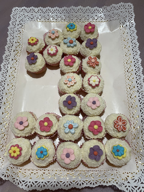 Posizionare i muffin a forma di numero in un vassoio e decorare con i fiorellini di zucchero attaccati con una goccia di cioccolato bianco.